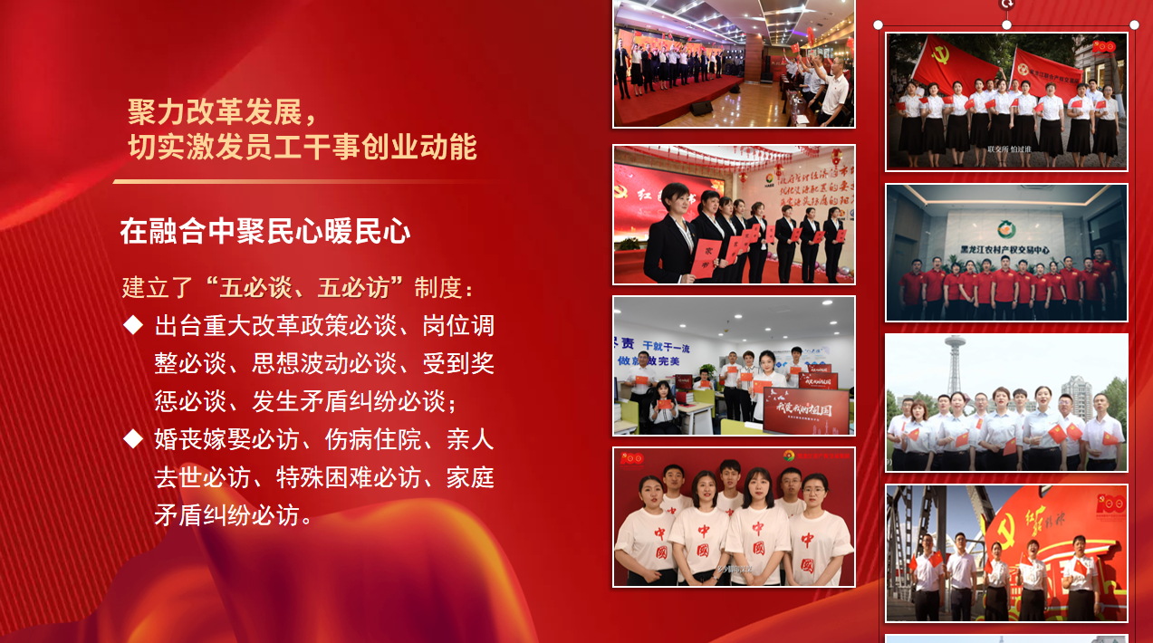 集團(tuán)黨委還引導(dǎo)黨員員工開(kāi)展自主教育,組織開(kāi)展“四愛(ài)四創(chuàng)”主題思想教育、“提質(zhì)增效、黨員先行”主題實(shí)踐活動(dòng)和“我為集團(tuán)發(fā)展獻(xiàn)一策”建議征集活動(dòng),充分激發(fā)員工“主人翁”意識(shí),通過(guò)發(fā)揮思想政治工作統(tǒng)一思想、凝聚共識(shí)的重要作用,推動(dòng)集團(tuán)不斷實(shí)現(xiàn)高質(zhì)量發(fā)展,為龍江全面振興全方位振興貢獻(xiàn)了平臺(tái)力量。
