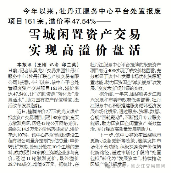 日前,記者從黑龍江交易集團牡丹江服務中心(牡丹江聯(lián)合產(chǎn)權(quán)交易有限公司)獲悉,今年以來,該中心平臺處置報廢資產(chǎn)交易項目161宗,溢價率達47.54%,讓“沉睡資源”轉(zhuǎn)化為“發(fā)展活水”,助力國有資產(chǎn)保值增值,激活改革發(fā)展?jié)撃堋?